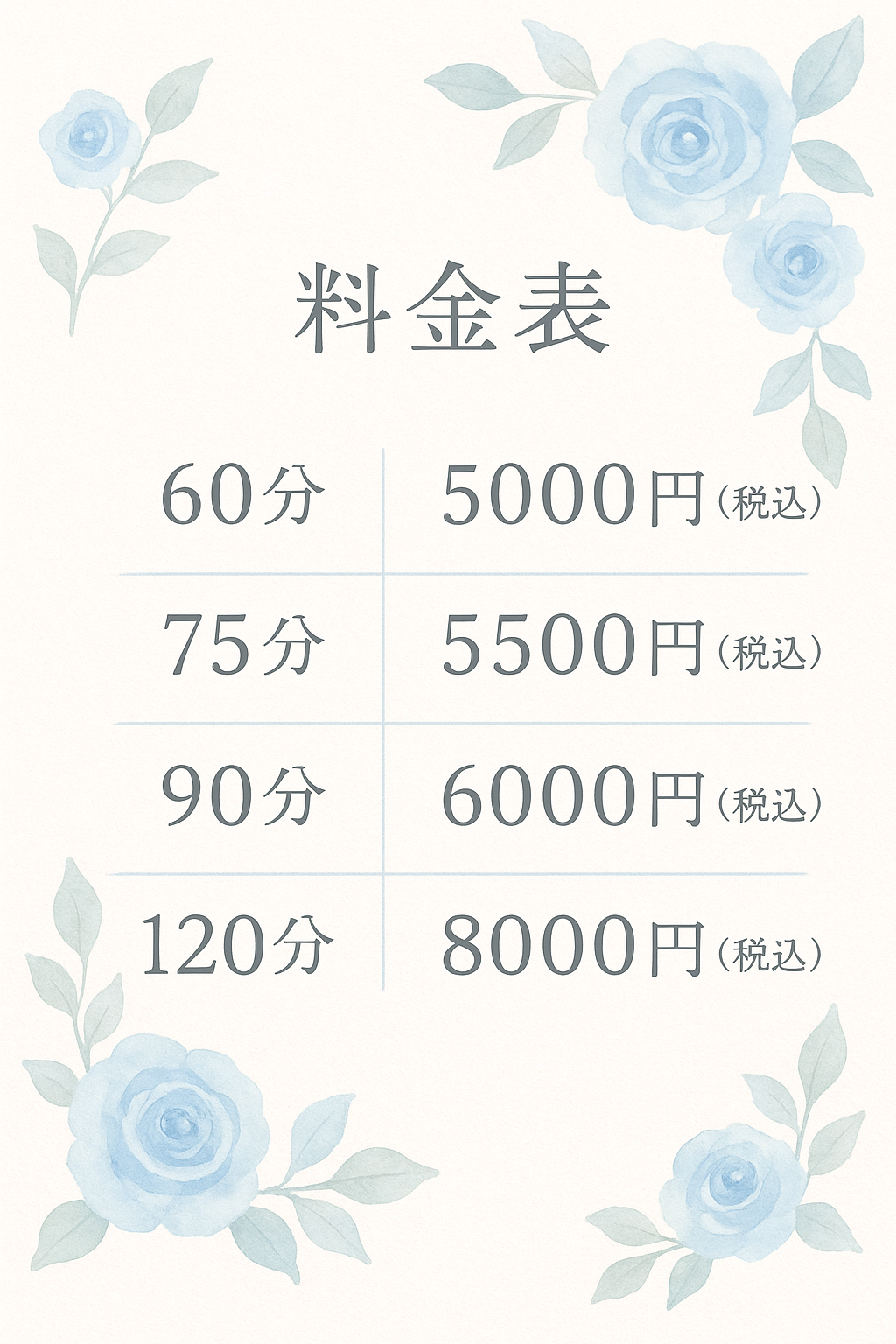 ●90分 6,000円税込 (ゆっくり話したい) ●120分 8,000円税込 (たっぷり話したい)
